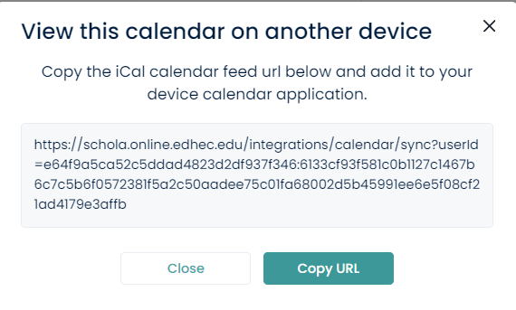 We highly recommend synchronizing your Schola Calendar with Outlook to ensure you never miss an event. To do this, go to the Schola Calendar, click the Export Calendar button, and then click Copy URL to copy the Calendar iCal.