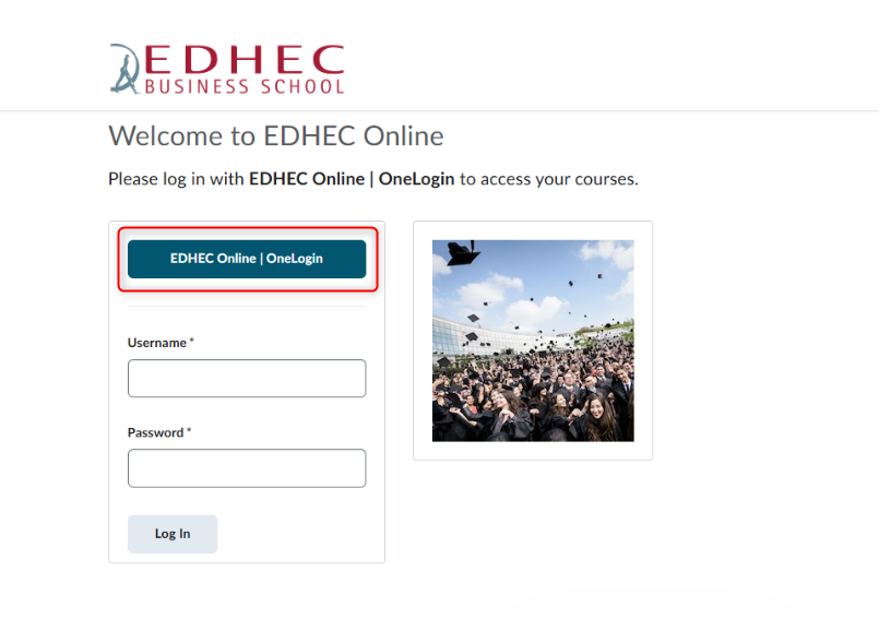A la première connexion, cliquez sur le bouton 'EDHEC Online | OneLogin'.