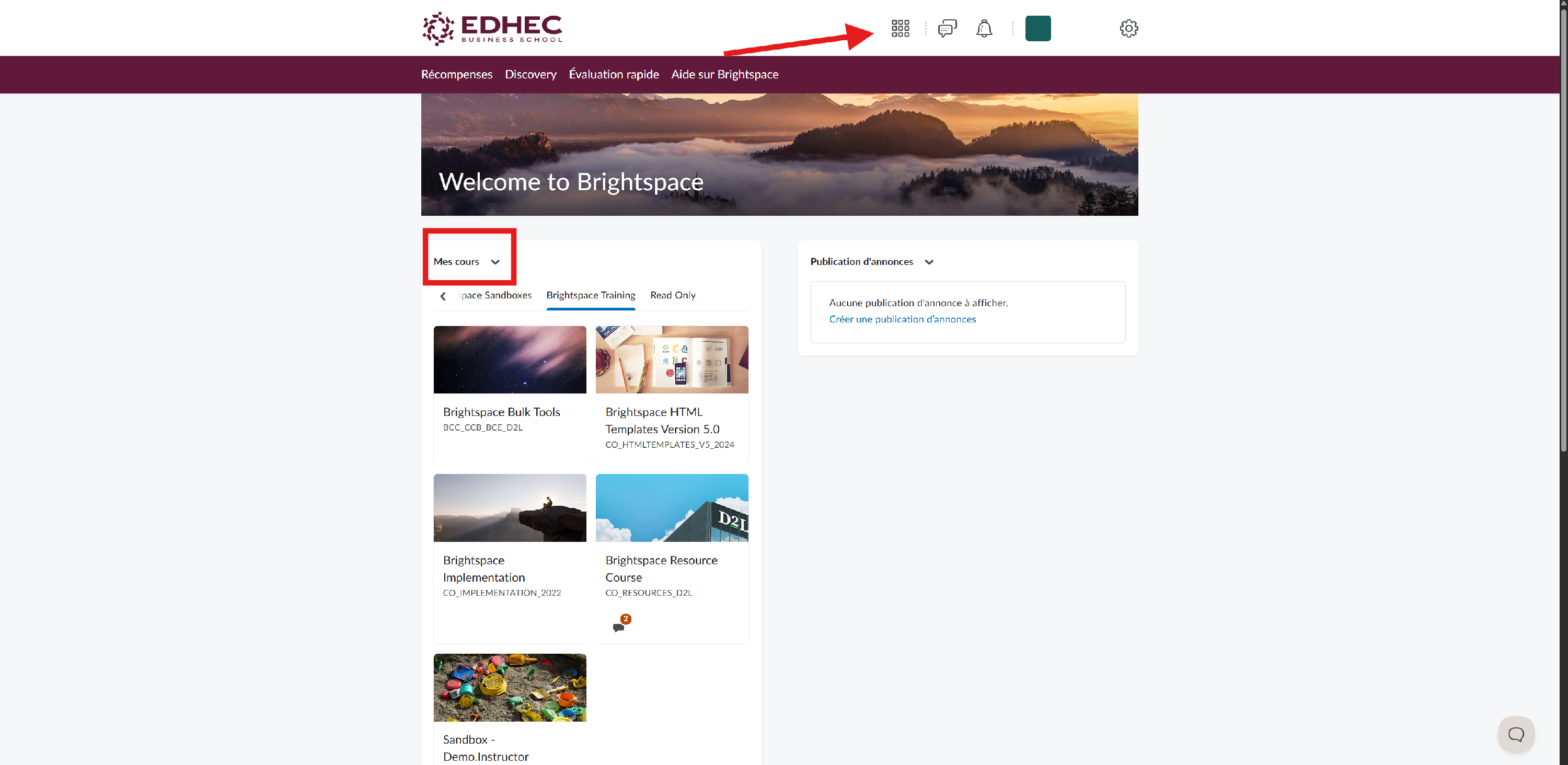 Après votre connexion à Brightspace, vous arrivez sur votre tableau de bord, la page d’accueil qui regroupe vos cours, les annonces importantes et différents raccourcis utiles.