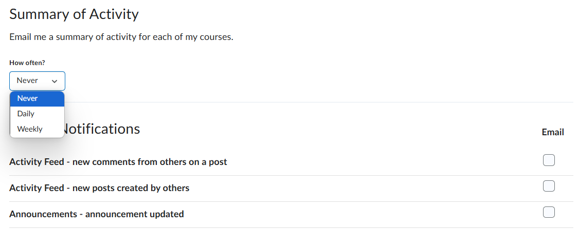- Dans Résumé de l’activité, sélectionnez la fréquence à laquelle vous souhaitez recevoir un email résumant toutes les activités de chacun de vos cours.