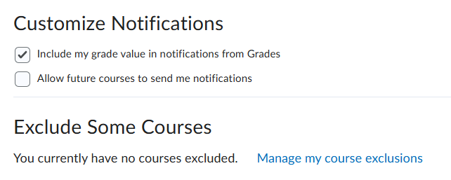 - Dans Exclure certains cours, cliquez sur Gérer mes exclusions de cours afin de définir les cours pour lesquels vous ne souhaitez pas recevoir de notifications.