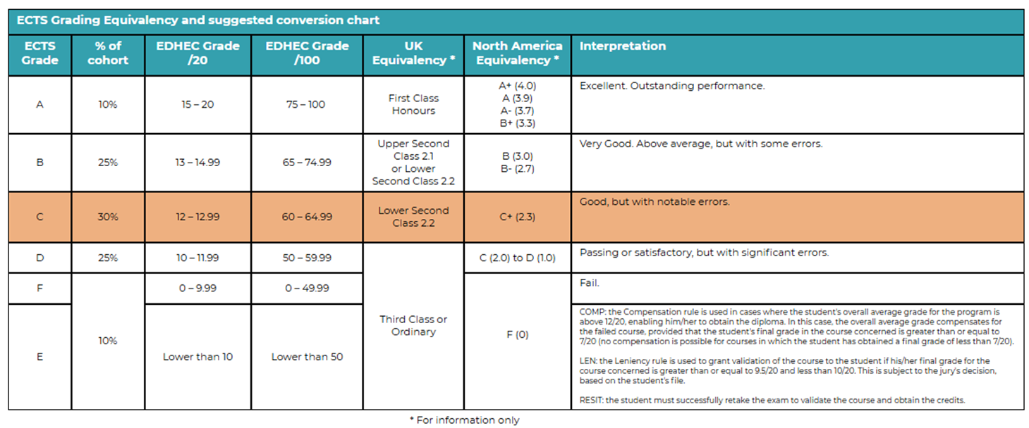 EDHEC Online’s grading system is based on values from 0 to 20. Above 10 is considered PASSING and below 10 is generally considered FAIL.